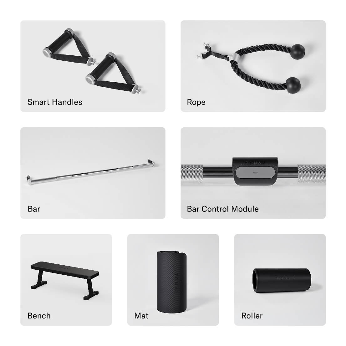 - Bar Control Module: Connects to Tonal over Bluetooth. Attach to the Smart Bar to turn weight on/off with a single button press