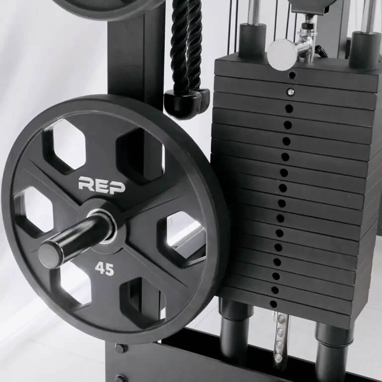 It’s an all-in-one machine that combines a half rack, Smith machine, and dual adjustable pulley system.